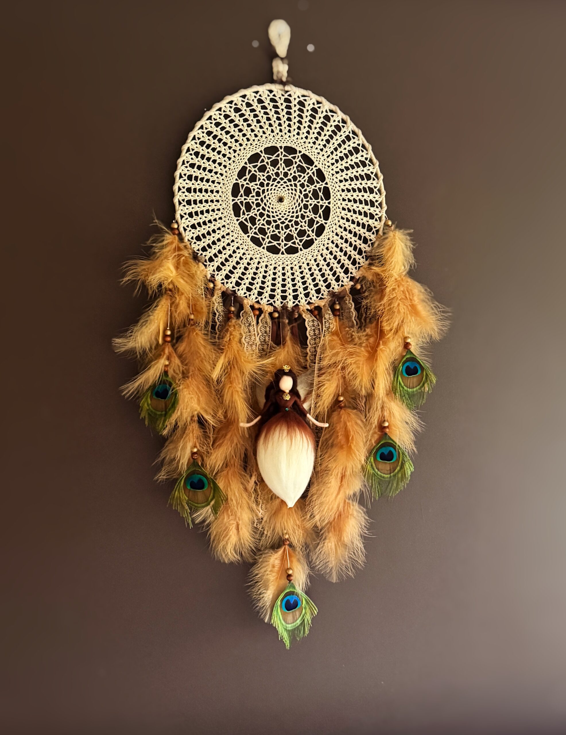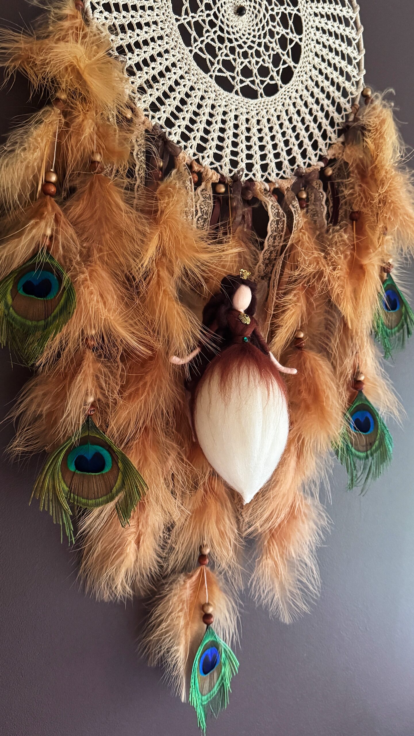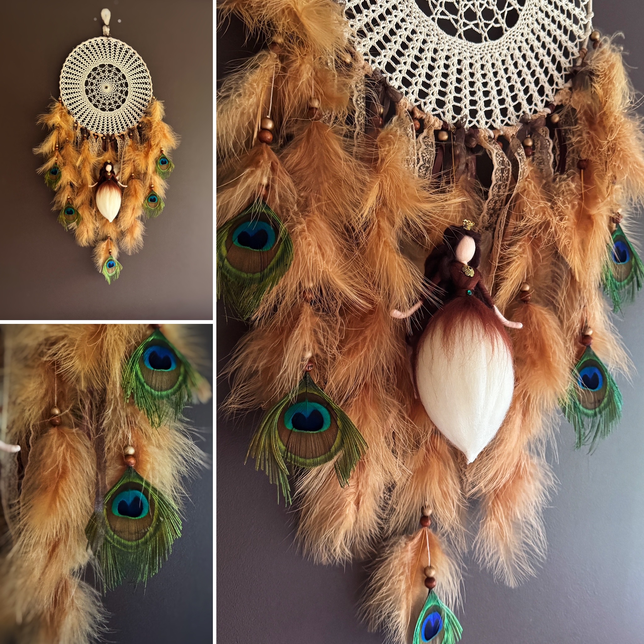 Unenäopüüdja, mis sümboliseerib õnne, rahulolu leidmist ja spirituaalset tasakaalu. Soojad toonid ja kaunis ingliprintsess loovad turvatunde. Kuningliku puudutuse annavad pilkupüüdvad paabulinnu suled ja kuldsed detailid.