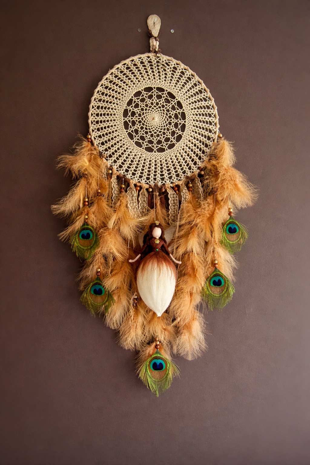 Unenäopüüdja, mis sümboliseerib õnne, rahulolu leidmist ja spirituaalset tasakaalu. Soojad toonid ja kaunis ingliprintsess loovad turvatunde. Kuningliku puudutuse annavad pilkupüüdvad paabulinnu suled ja  kuldsed detailid.